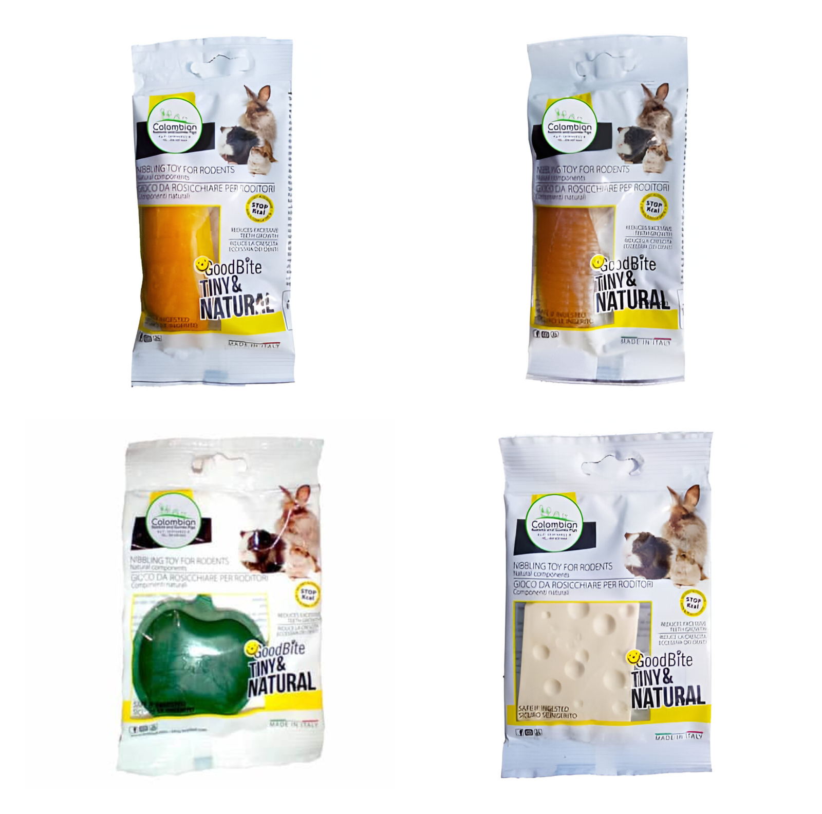 Es un Juguete especial para morder, a base de componentes naturales, atóxicos y biodegradables en distintas y divertidas formas (manzana, queso, maíz y zanahoria).